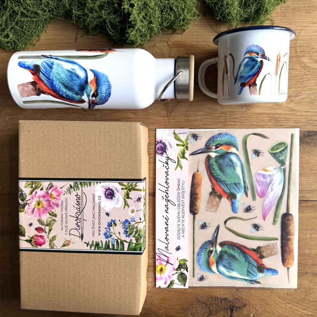 • Výhodná sada termolahve, plecháčku a nažehlovaček s autorským akvarelovým motivem